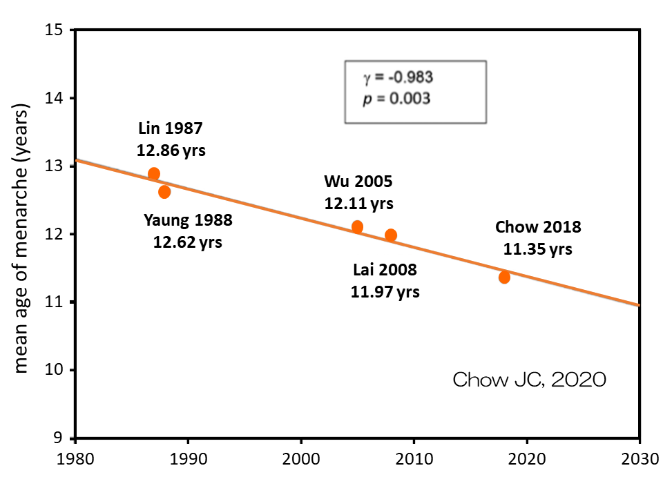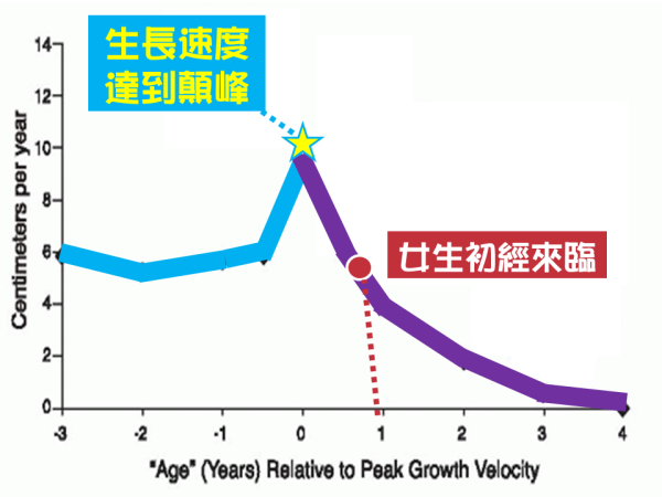 成長發育的速度會從進入青春期後開始加速,速度達到巔峰之後再逐漸放慢,直到成長結束。初經來臨的時間點大約在[成長速度達到巔峰後的一年],初經之後成長發育的速度開始逐漸放慢,身高仍然會繼續長高,但是速度會逐漸變慢,根據2004年台灣北部的統計資料(Lee TS, 2004)女孩在[15歲]後成長趨緩,一年長高小於1公分。